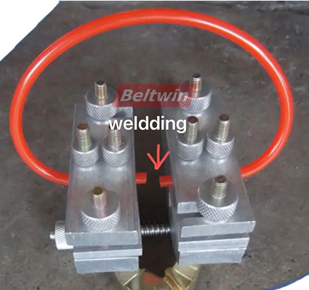 4) Coloque el soldador entre los extremos de la correa, apriete suavemente la abrazadera, haga que ambos extremos estén completamente en contacto con el soldador.