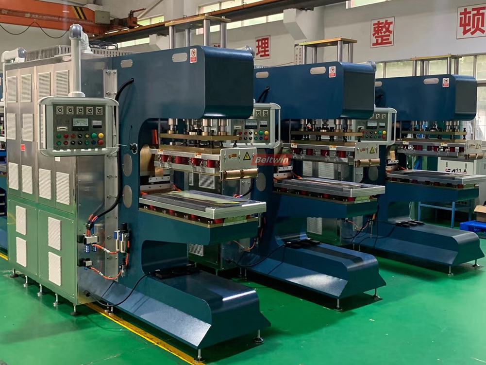 La máquina de soldadura de alta frecuencia de 25KW se utiliza especialmente para juntas de cintas de correr de PVC TPU. También puede realizar soldaduras de perfil de tacos. Longitud máxima de soldadura de tacos: 1200 mm.